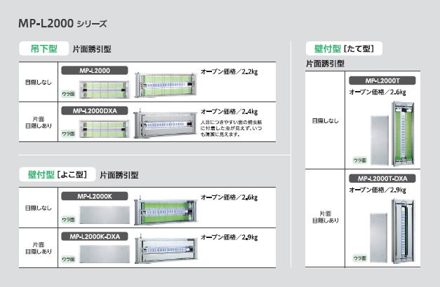 ムシポンMPX-2000DXAAはどちらの面からも捕虫紙に付着した虫が見えないため、フロアのどこでも設置が可能な両面誘引タイプです。